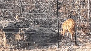 Soms neem ik haar niet waar en dan maak ik haar aan het schrikken en zie ik haar nog net wegrennen tussen de dorre takken en bomen. Zondag kwam ze samen met haar mama…ik verdenk de mama ervan dat ze de kleine bij ons achterlaat want heel vaak is ze in geen velden of wegen te bekennen en toen ik haar riep kwam ze warempel aangehuppeld tot zo’n 2 meter van het hek. Ik denk dat ze toen pas besefte wat ze deed en met een noodgang ging ze terug.