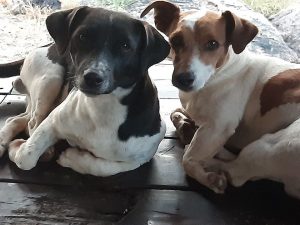 De lodge ‘next door’ heeft een roedel Jack Russels en die zijn voor de duvel niet bang en vliegen overal op af. Geritsel in de struik ja hoor dan gaan we gewoon even kijken. Dat kijken is al twee keer slecht afgelopen… twee van de honden hebben nog maar 1 oog. Tja slangen houden niet van nieuwsgierige aagjes. En Jack Russels houden niet van gevangenschap, dus toen kortgeleden ook op de lodge een elektrisch hekwerk in werking ging, vonden de jongsten de stroomschok net iets te veel, maar het weerhoud ze er niet van om onder het hek door te graven.