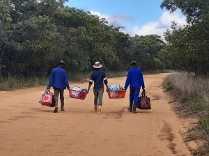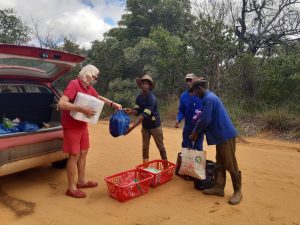 En als je dan hoort dat vrienden die aan de andere kant van Lephalale wonen, afgesloten zijn van de buitenwereld, omdat de Witkop-pad eerst een rivier en daarna een modderpad is geworden, tja dan bied je hulp aan. We zijn niet van het aanleggen van wegen, of droogleggen van land, alhoewel dat ergens wel in mijn genen moet zijn opgeslagen. We beperken ons tot boodschappen doen en brengen ze tot daar waar de pad begaanbaar is. Drie sympathieke jongens komen ons al te voet tegemoet, de laarzen tot kuithoogte vol modder.