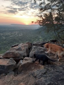 Overal hoor ik de vogels fluiten en roepen. En de honden spelen nog even in de koelte van de ochtend.