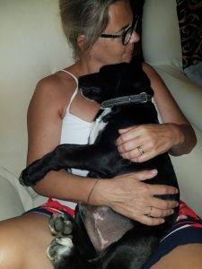 De eerste nacht, dus misschien moet ik nog niet te hard juichen. Finch is nu 12 weken en we beginnen er achter te komen dat hij intelligent is, maar inderdaad ook dat sterke Boerbull karakter heeft. En om het lieve en het aanhankelijke een beetje te stimuleren doe ik aan een soort van kangaroe-en.