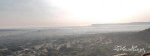 Het mooiste deze ochtend zijn niet de kleuren van de zonsopgang maar de laaghangende mist over de bush. Van boven af gezien zo sprookjes-achtig mooi. Moeilijk om op beeld te vangen bij de warme zonnegloed, maar beter als de zon echt door is.
